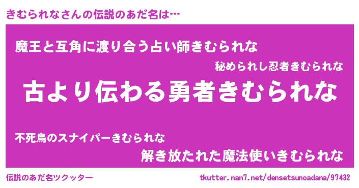 | 意味不明あだ名 | 『住所不定無職きむられな(79歳)』 |