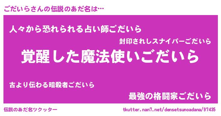 | 男性向けラノベタイトル風あだ名 | 『ごだいら~年齢イコール彼女いない歴の魔法使い~』 |
