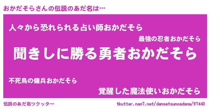 | 胡散臭い通販商品みたいなあだ名 | 『絶対に幸福をもたらす水素水…その名も「おかだそら」』 |