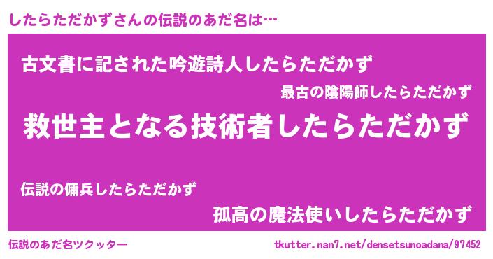 | 男性向けラノベタイトル風あだ名 | 『したらただかず~年齢イコール彼女いない歴の魔法使い~』 |