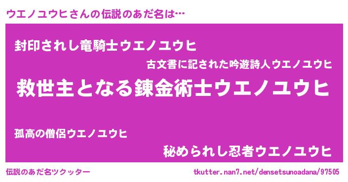 | 男性向けラノベタイトル風あだ名 | 『ウエノユウヒ~年齢イコール彼女いない歴の魔法使い~』 |