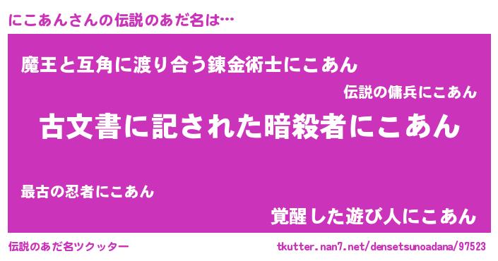 | 男性向けラノベタイトル風あだ名 | 『この素晴らしい世界ににこあんを!』 |