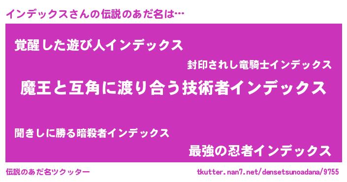 | ヒーロー風カッコイイあだ名 | 『愛の使者インデックス』『仮面インダー』 |