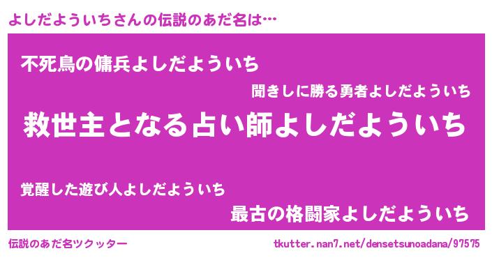 | 男性向けラノベタイトル風あだ名 | 『よしだよういち~年齢イコール彼女いない歴の魔法使い~』 |