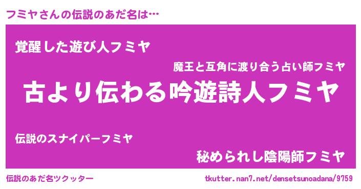 | 男性向けラノベタイトル風あだ名 | 『フミヤという概念が存在しない退屈な世界 』 |