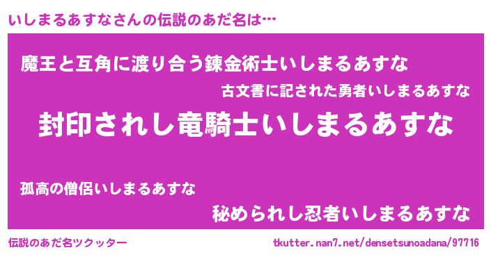 | 胡散臭い通販商品みたいなあだ名 | 『億万長者になれるブレスレット…その名も「いしまるあすな」』 |