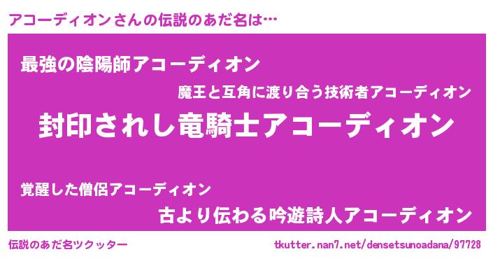 | 男性向けラノベタイトル風あだ名 | 『アコーディオンアートオンライン』 |