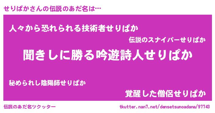 | 意味不明あだ名 | 『永久保存せりぱか』『自称せりぱか』 |