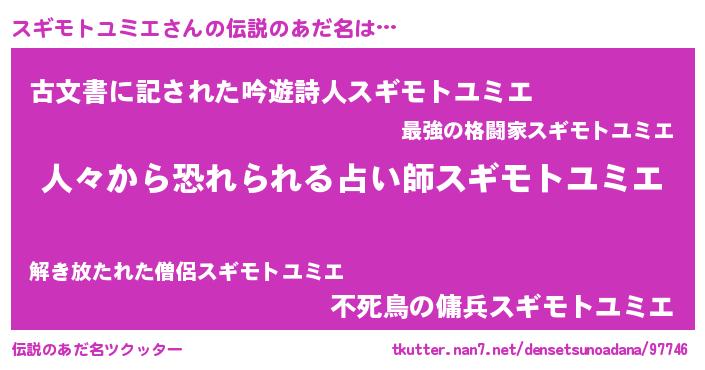 | 男性向けラノベタイトル風あだ名 | 『スギモトユミエスレイヤー』 |