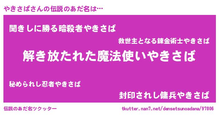 | 男性向けラノベタイトル風あだ名 | 『この素晴らしい世界にやきさばを!』 |
