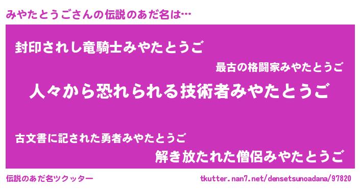 | 胡散臭い通販商品みたいなあだ名 | 『100人中100人が認めたマグネット磁石…その名も「みやたとうご」』 |
