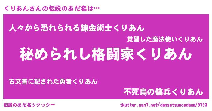 | 女子向けラノベタイトル風あだ名 | 『くりあんの雑貨屋さん』『闇のくりあん』 |