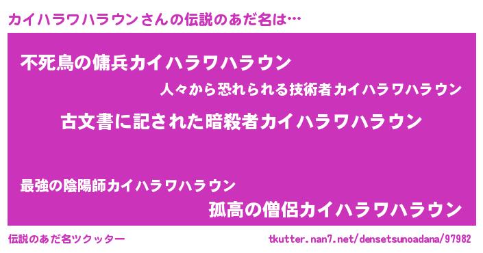 | 男性向けラノベタイトル風あだ名 | 『この素晴らしい世界にカイハラワハラウンを!』 |