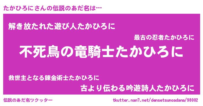 | 意味不明あだ名 | 『自称たかひろに』『ペロリンたかひろに』 |