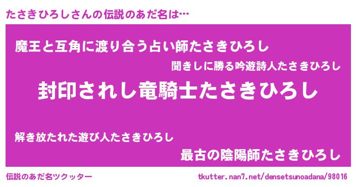 | 男性向けラノベタイトル風あだ名 | 『たさきひろしに滅ぼされるだけの簡単なお仕事です』 |