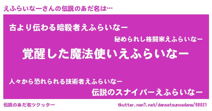 | 男性向けラノベタイトル風あだ名 | 『Re:えふらいなーから始める異世界生活』 |