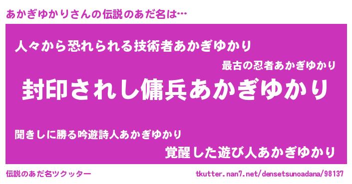 | 女子向けラノベタイトル風あだ名 | 『悪役あかぎゆかりに転生したようですが、知った事ではありません』 |