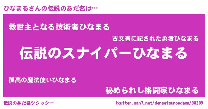 | ヒーロー風カッコイイあだ名 | 『スーパーヒナマル』『仮面ヒナダー』 |