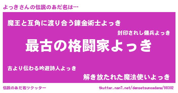 | ヒーロー風カッコイイあだ名 | 『ウルトラよっきマン』『銀牙騎士ヨッ』 |