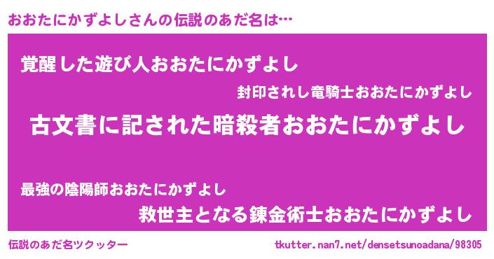 | 男性向けラノベタイトル風あだ名 | 『おおたにかずよし~年齢イコール彼女いない歴の魔法使い~』 |