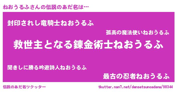 | 男性向けラノベタイトル風あだ名 | 『Re:ねおうるふから始める異世界生活』 |