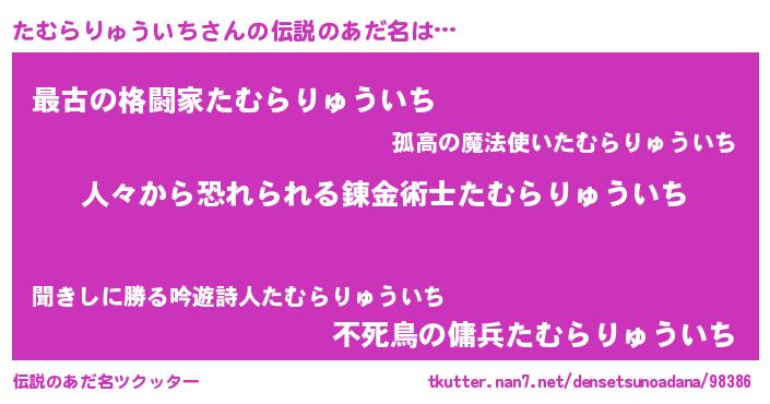 | 男性向けラノベタイトル風あだ名 | 『おまえをオタクにしてやるから、俺をたむらりゅういちにしてくれ! 』 |