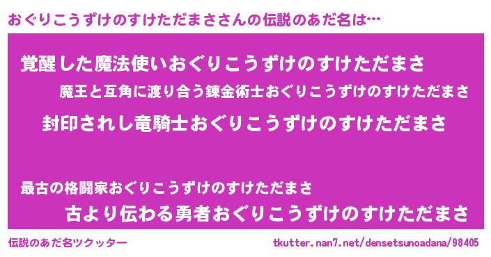 | 男性向けラノベタイトル風あだ名 | 『おぐりこうずけのすけただまさ~年齢イコール彼女いない歴の魔法使い~』 |