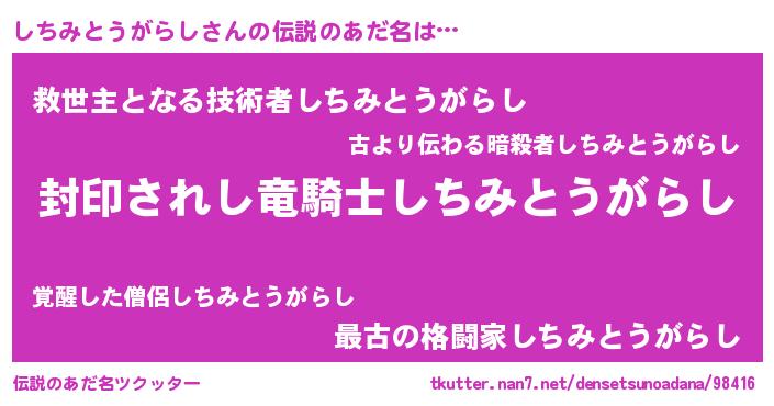 | 胡散臭い通販商品みたいなあだ名 | 『億万長者になれるブレスレット…その名も「しちみとうがらし」』 |