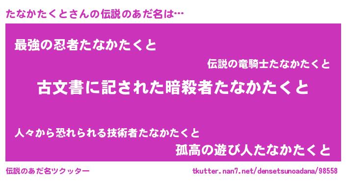 | 男性向けラノベタイトル風あだ名 | 『たなかたくと~年齢イコール彼女いない歴の魔法使い~』 |