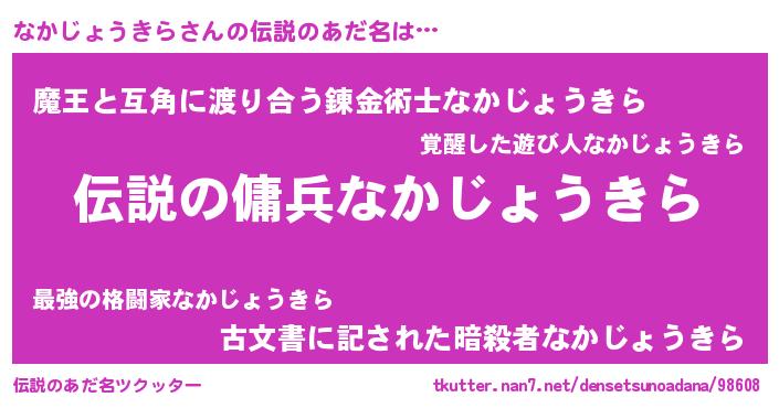 | 意味不明あだ名 | 『住所不定無職なかじょうきら(56歳)』 |