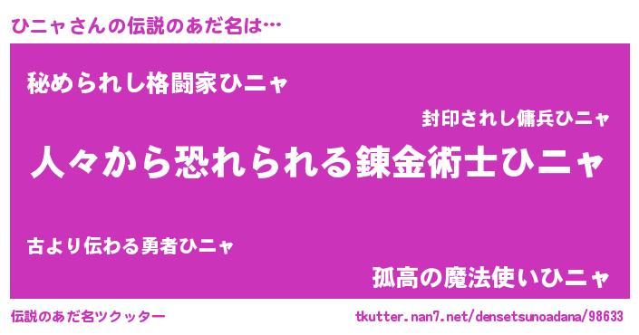 | 意味不明あだ名 | 『住所不定無職ひニャ(89歳)』 |