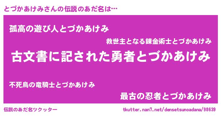 | ヒーロー風カッコイイあだ名 | 『ネオトヅカアケミ』『銀牙騎士トヅ』 |