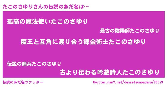| 男性向けラノベタイトル風あだ名 | 『Re:たこのさゆりから始める異世界生活』 |