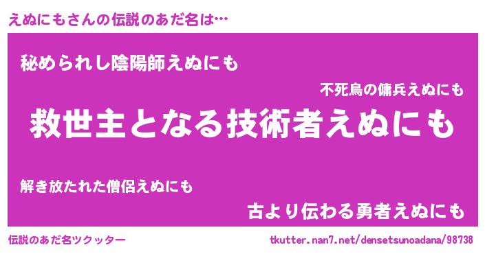 | 意味不明あだ名 | 『住所不定無職えぬにも(10歳)』 |