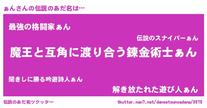 | 意味不明あだ名 | 『住所不定無職ぁん(85歳)』『自称ぁん』 |
