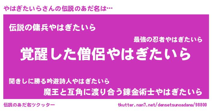 | 男性向けラノベタイトル風あだ名 | 『やはぎたいらに滅ぼされるだけの簡単なお仕事です』 |