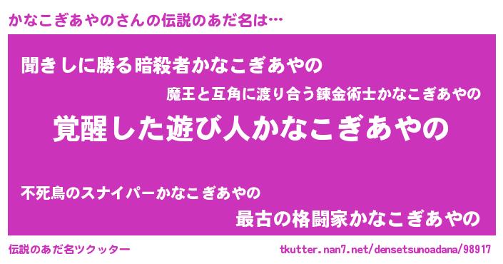 | ヒーロー風カッコイイあだ名 | 『炎刃騎士カナ』『ネオカナコギアヤノ』 |