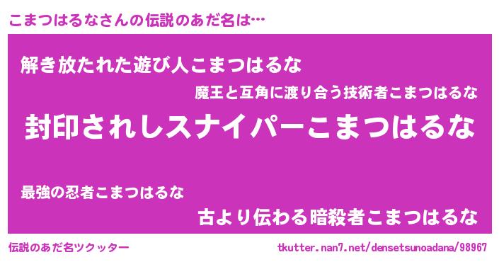 | 胡散臭い通販商品みたいなあだ名 | 『億万長者になれる霊験あらたかなお札…その名も「こまつはるな」』 |