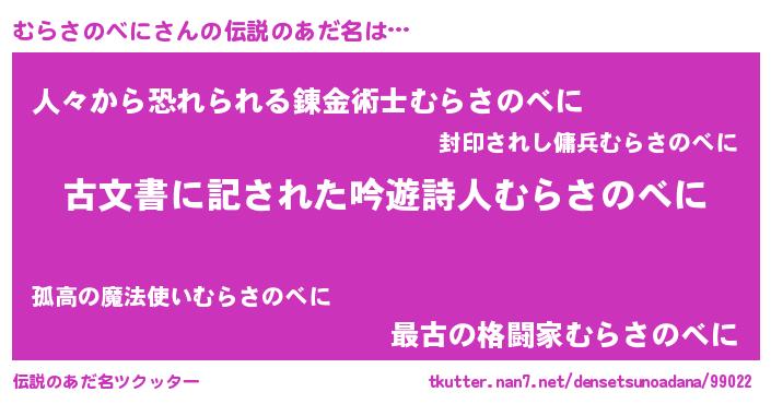 | 男性向けラノベタイトル風あだ名 | 『むらさのべに~年齢イコール彼女いない歴の魔法使い~』 |