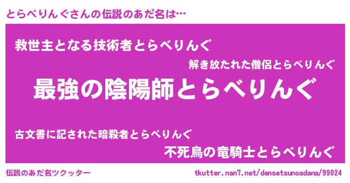 | 男性向けラノベタイトル風あだ名 | 『うちのとらべりんぐが世界を掌握している!』 |