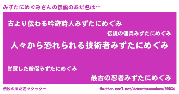 | 意味不明あだ名 | 『めかぶ科みずたにめぐみ属』 |