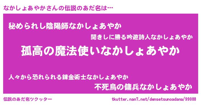 | 胡散臭い通販商品みたいなあだ名 | 『信頼と実績のサプリメント…その名も「なかしょあやか」』 |