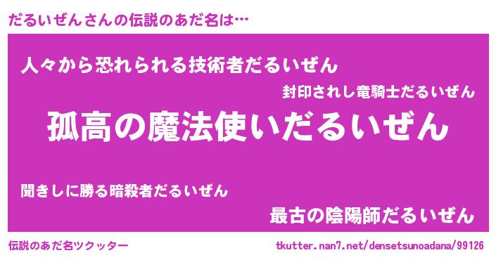 | 男性向けラノベタイトル風あだ名 | 『魔弾の王とだるいぜん』 |