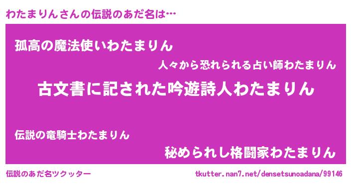 | 男性向けラノベタイトル風あだ名 | 『わたまりん~年齢イコール彼女いない歴の魔法使い~』 |