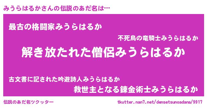 | ヒーロー風カッコイイあだ名 | 『銀牙騎士ミウ』『スーパーミウラハルカ』 |
