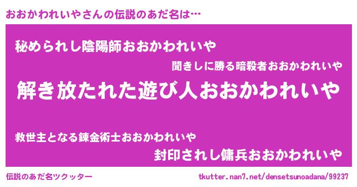 | 男性向けラノベタイトル風あだ名 | 『Re:おおかわれいやから始める異世界生活』 |