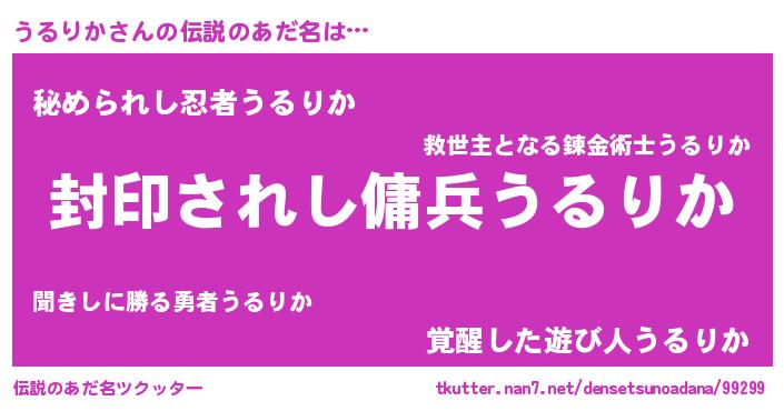| 男性向けラノベタイトル風あだ名 | 『うるりか~年齢イコール彼女いない歴の魔法使い~』 |
