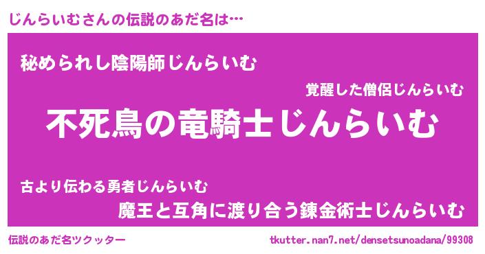 | 男性向けラノベタイトル風あだ名 | 『魔弾の王とじんらいむ』 |