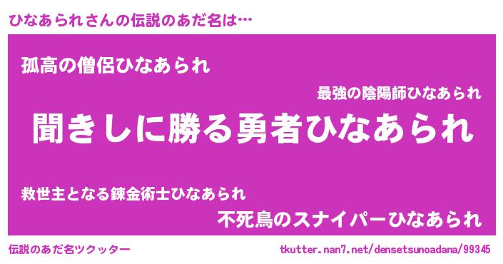| ヘコむあだ名 | 『ひなあられ(遠い目)』『ひなお』 |