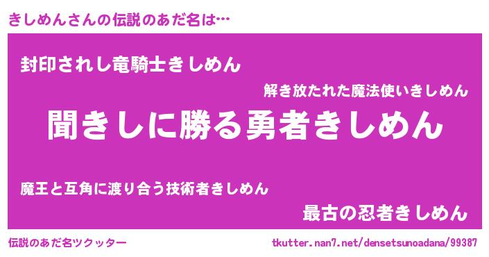 | 男性向けラノベタイトル風あだ名 | 『キシメンスレイヤー』 |